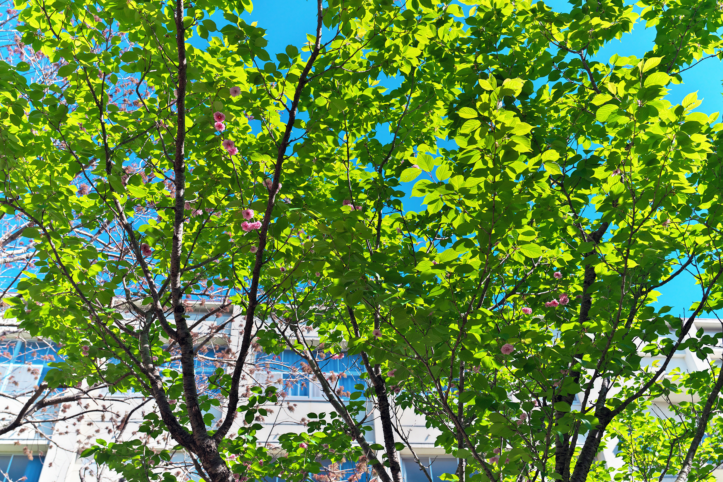 きれいな青空を背景に、緑の葉が輝いていました。
